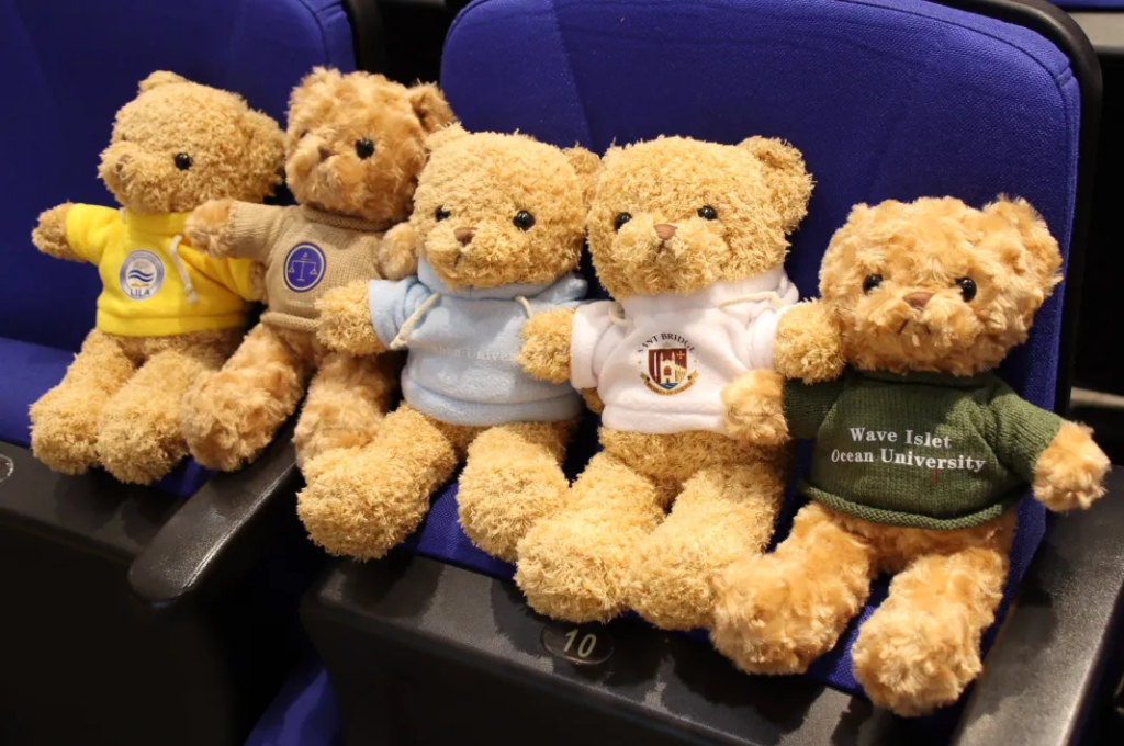 升导老师为获奖大学组定制了印有同学设计的大学logo的小熊